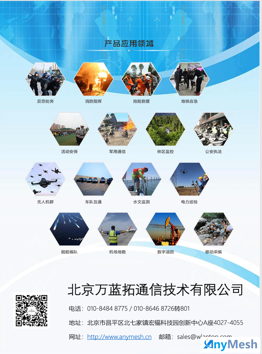万蓝AnyMesh无线自组网系统是采用全新‘无线网状网络’理念设计的移动宽带多媒体通信系统。利用无中心自组网的分布式网络架构,所有系统节点可以在非视距、快速移动条件下实现多路语音、数据、图像等多媒体信息的实时交互。同时系统支持任意网络拓扑结构,各节点设备可以随机快速移动,在不影响系统传输的情况下快速改变和更新系统拓扑结构。整体系统部署方便、使用灵活、操作简单、维护方便。